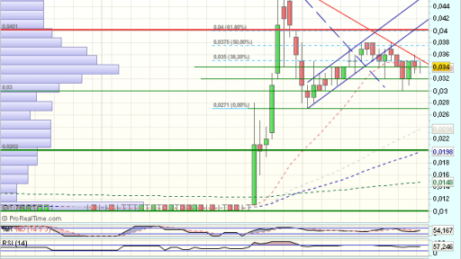 En el medio plazo, define el rango lateral como de agotamiento bajista, dando lugar a un fuerte impulso alcista, que supera la media de 200 sesiones, hasta encontrar obstáculos en los 0,048 euros, que fuerzan una consolidación.