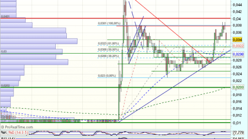 En el medio plazo, define el rango lateral como de agotamiento bajista, dando lugar a un fuerte impulso alcista, que supera la media de 200 sesiones, hasta encontrar obstáculos en los 0,048 euros, que fuerzan una consolidación, hasta los 0,023 euros.