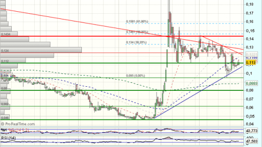 En el medio plazo, tras una consolidación lateral, encuentra soporte en los 0,095 euros, desde donde inicia un nuevo impulso al alza.