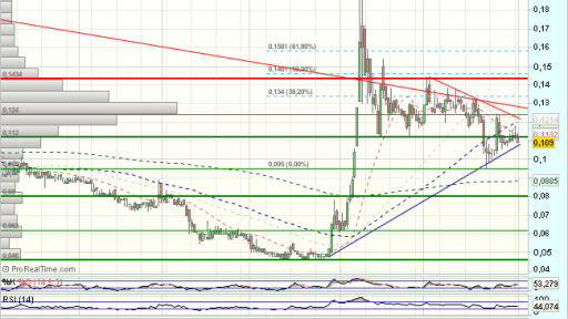 En el medio plazo, tras una consolidación lateral, encuentra soporte en los 0,095 euros, desde donde inicia un nuevo impulso al alza.