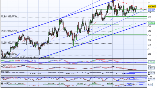 En el corto plazo encontramos el precio por encima de medias de 20, 70 y 200 en un movimiento predominantemente lateral con una oscilación en torno a los 39,6 y cada vez más reducida dentro de los límites de dos directrices de signo contrario habiendo perforado levemente en el día de ayer la superior bajista.