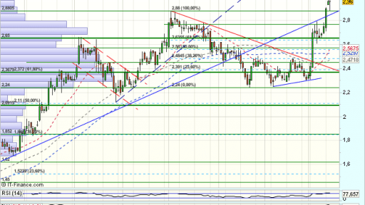 En el medio plazo, tras consolidar ante los 2,66, vuelve a encontrar apoyos en los 2,12 euros, para un nuevo impulso alcista que supera el 100% de recuperación del impulso bajista previo.