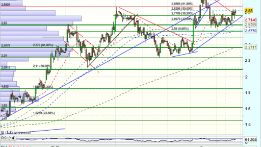 En las últimas sesiones, perfora el 61,8% de retroceso del impulso alcista previo, hasta los 2,58, desde donde intenta el rebote, derivando en un rango lateral, que rompe al alza, con primeros objetivos en los ……….Sigue