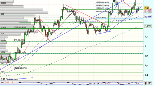 En el medio plazo, tras consolidar ante los 2,66, vuelve a encontrar apoyos en los 2,12 euros, para un nuevo impulso alcista que supera el 100% de recuperación del impulso bajista previo.
