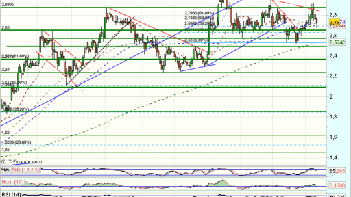 En el medio plazo, tras consolidar ante los 2,66, vuelve a encontrar apoyos en los 2,12 euros, para un nuevo impulso alcista que supera el 100% de recuperación del impulso bajista previo.