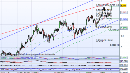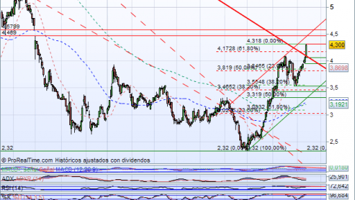 JOSE JUANMiembro JOSE JUANMiembro- No presenta signos de debilidad. Por lo tanto estando dentro, solo ajustar el stop o recoger parte de la cosecha. - En todo caso sí que merecería la pena salir de éste para «pillar» un chicharro como Reno Medici: - Adjuntos: JOSE JUANMiembro JOSE JUANMiembro- Es bueno que de nuevo te encuentres entre nosotros. Cuidate Mikel.  JOSE JUANMiembro JOSE JUANMiembro- – REPSOL Bankinter recomienda comprar con precio objetivo de 20 euros  JOSE JUANMiembro JOSE JUANMiembro- – BBVA: Nomura rebaja su consejo de neutral a reducir - – SANTANDER: Nomura eleva la recomendación de reducir a neutral  JOSE JUANMiembro JOSE JUANMiembro- – REPSOL Equita rebaja la recomendación de comprar a mantener - – DEUTSCHE BANK Oddo mejora la recomendación de neutral a comprar  JOSE JUANMiembro JOSE JUANMiembro- – BARCLAYS: Société Générale mejora la recomendación de mantener a comprar  JOSE JUANMiembro JOSE JUANMiembro- – ACS: Exane mejora la recomendación de infraponderar a neutral - – Ebro Foods: Exane recorta la recomendación de sobreponderar a neutral  JOSE JUANMiembro JOSE JUANMiembro- – REPSOL: Inversis aconseja comprar con precio objetivo de 19,24 euros - – TELEFÓNICA : Inversis recomienda comprar con precio objetivo de 11,84 euros  JOSE JUANMiembro JOSE JUANMiembro- – AXA: BofAML eleva la recomendación de infraponderar a neutral - – REPSOL: Credit Suisse rebaja la recomendación de sobreponderar a neutral  JOSE JUANMiembro JOSE JUANMiembro- Bienvenido de nuevo Christian  JOSE JUANMiembro JOSE JUANMiembro- Hoy cierra en los 4,30 euros con ganancias del 5,89% superando con fuerza y volumen directriz bajista de largo plazo y recuperando el 61,80 % de anterior impulso bajista. Se ha dejado un pequeño gap en los 3,947 – 3,96 euros. - Adjuntos: JOSE JUANMiembro JOSE JUANMiembro- – EDF: RBC fija recomendación en igual que mercado, con precio objetivo de 21 euros - – SABADELL: Nomura recomienda infraponderar con precio objetivo de 1,30 euros  JOSE JUANMiembro JOSE JUANMiembro- – INDITEX: Exane eleva la recomendación de neutral a infraponderar - – NH HOTELES: Natixis mejora la recomendación de reducir a neutral  JOSE JUANMiembro JOSE JUANMiembro- Pues yo vuelvo Christian. - Trataré de cerrar parte del hueco que nos dejas. Disfruta y carga pilas. - Lo de no maltratar a los mercados habrá que decírselo a los que disponen de armamento al efecto, que son muchos y variados.