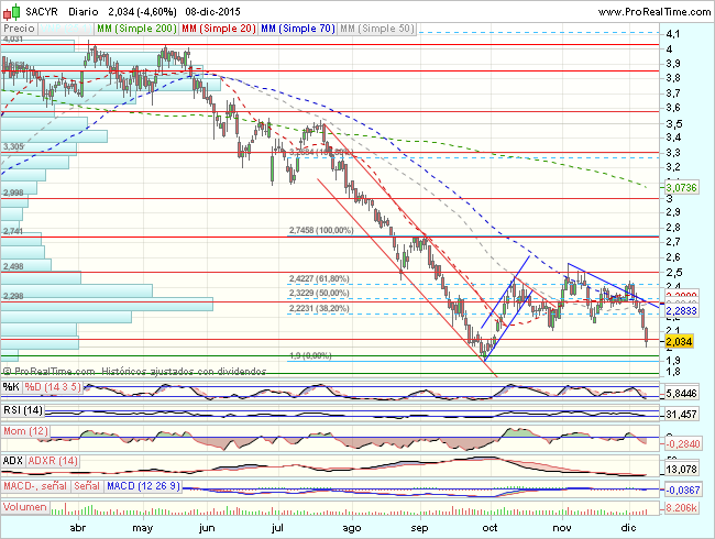 A corto plazo la cotización se encuentra dudando entre el techo de los 2,52 y el suelo de los 2,15-2,06, gama lateral de precios en la que además establece una pauta de triángulo simétrico al mismo tiempo que el oscilador MACD cotiza sin rumbo y muy próximo a cero.