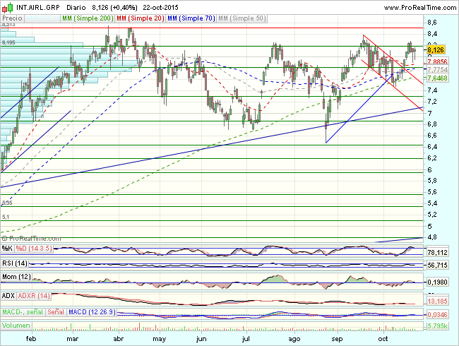 La aerolínea, fruto de la fusión de Iberia y British Airways, vuela alto en el parqué. Cotiza a ratios más atractivas que sus competidoras: cuenta con un PER (relación precio/benefico por acción) de 12 veces, frente a las 18 veces del sector turístico de Europa. Y tiene el apoyo de las firmas de inversión que le siguen: un 79% de los expertos aconseja tomar posiciones en la compañía, frente a sólo el 7% que recomienda vender. (Ver analisis técnico de IAG)