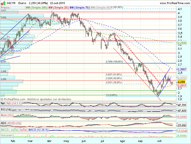 La constructora esta cogiendo carrerilla. Es uno de los mejores valores del Ibex ytiene un recorrido al alza del 70%, hasta alcanzar los 4,44 euros, según la valoración de los expertos. Los analistas esperan que Sacyr siga reduciendo su abultado endeudamiento. La mayoría de los expertos (10 de un total de 18) aconsejan «comprar»y seis «mantener». Goza, pues, de buenas recomendaciones. (Ver analisis técnico de SACYR)