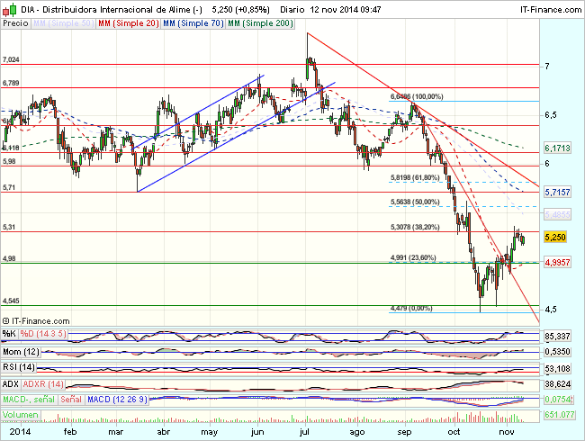 Dia ha recuperado algo de terreno tras la presentación de resultados del tercer trimestre (el 27 de octubre). Pero aun así, continúa cotizando con un fuerte descuento en términos de PER 2015, con una ratio de 12,9 veces frente a las 15,2 del sector en Europa. El consenso prevé que suba un 21,6% en Bolsa, hasta los 6,41 euros.