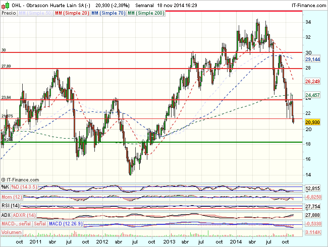 La constructora ha vivido una mala racha en el parqué en lo que va de año. Se deja un 26%, hasta los 21,79 euros. La caída, agravada por la pérdida de niveles clave, se inició a raíz de los resultados del primer semestre que la compañía publicó el 30 de julio. Un mal sabor de boca que ha persistido en el mercado tras las cuentas del tercer trimestre, presentadas el pasado jueves.