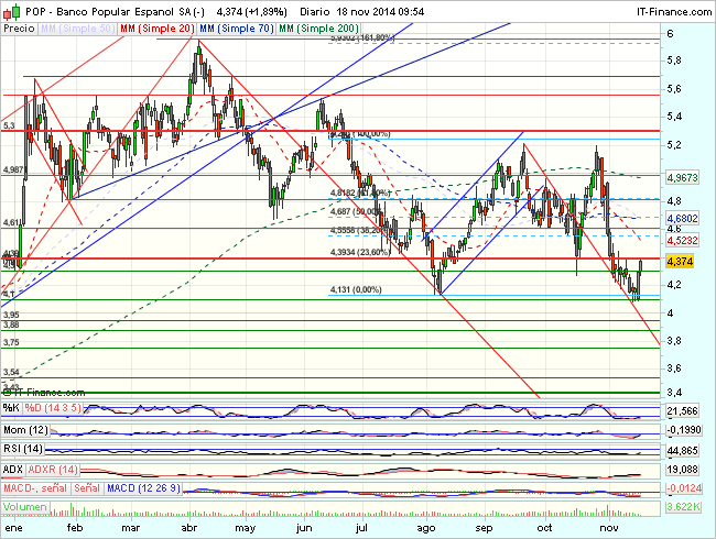 La experta también sitúa a CaixaBank entre sus valores favoritos dentro del sector. En cambio Faus, cree que Popular tendría más potencial a corto plazo desde el punto de vista técnico. «Podría ascender hasta las cercanías de los 5 euros», afirma. El valor, que cae un 4,7% en 2014, cerró ayer en los 4,17.
