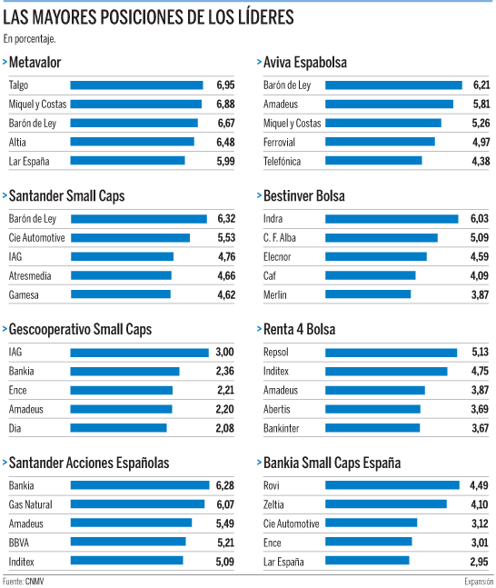 Los ocho mejores fondos de Bolsa española consiguieron el año pasado rentabilidades de entre el 6,7% del Bankia Small & Mid Caps España y el 17,2% del Metavalor, frente al descenso del 7,1% del Ibex, según datos de Morningstar.Y lo lograron, en parte, escapando del selectivo. O, al menos, siendo muy cuidadosos a la hora de elegir empresas del índice y priorizando la exposición a las compañías de pequeña y mediana capitalización.
