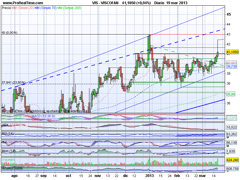 En definitva Viscofán se encuentra actualmente en fase lateral de consolidación con unos indicadores que muestran mejoría de cara a un nuevo impulso alcista con unos primeros objetivos al alza en los 41,7 y 42,46 que de superar lo llevarán a buscar nuevamente los máximos de 43.