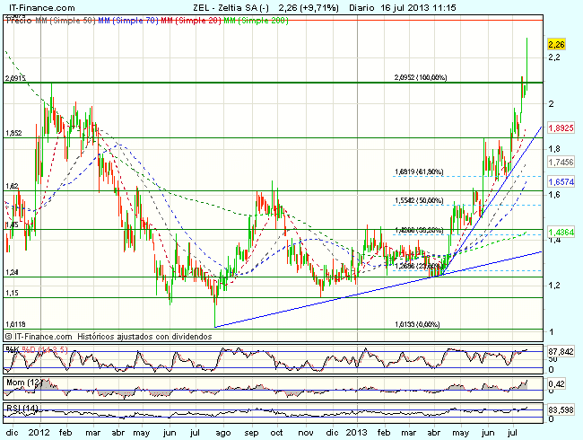 Zeltia, desde que encontrara apoyos en los 1,23 euros, ha acelerado tendencia con fuerza, superando resistencias y media de 200 sesiones y con el movimiento de hoy, supera el 100% de recuperación de todo el impulso bajista previo desde enero de 2.012, abriendo nuevos objetivos al alza en los 2,38 euros.