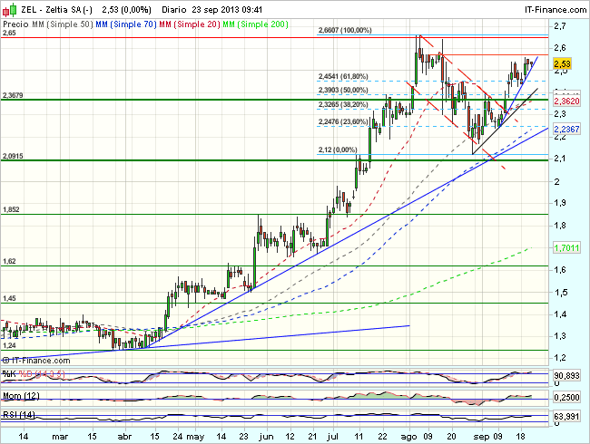 Mientras Zeltia se mantenga sobre el soporte en los 2,35, las posibilidades alcistas permanecen vigentes, su perdida si empeoraría el aspecto técnico de Zeltia, y podría dar lugar a una mayor consolidación, en dirección a los 2,24 – 2,12 euros.